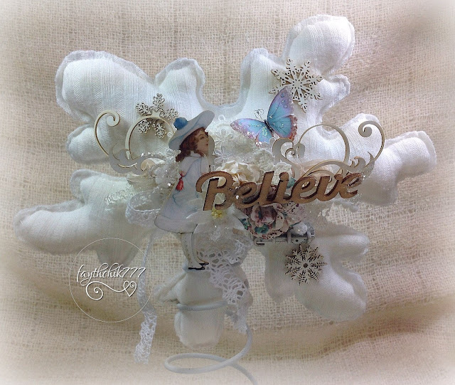 I decided to create a shabby chic, winter-filled wonderland full of warmth and inviting colors of creams, whites, frosty blues and even a tiny amount of teal! I wanted to incorporate a rusty old bedspring as the base (but yikes!!! I felt terribly guilty about painting it! LOL!) and a snowflake template I found on the internet that I resized, machine stitched and stuffed! I am currently creating for upcoming Christmas bazaars and wanted to design a quick, yet simple, inviting alternative for home décor for the holidays!